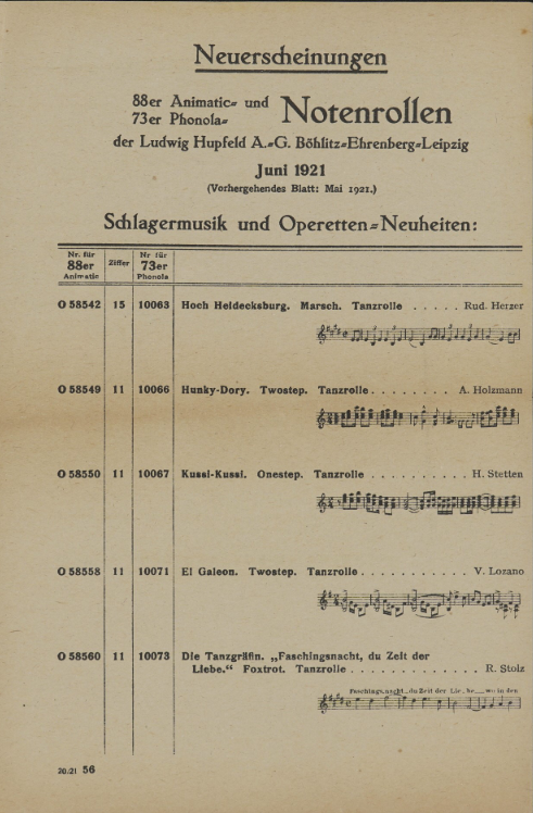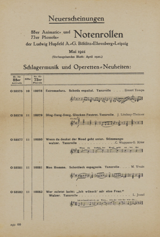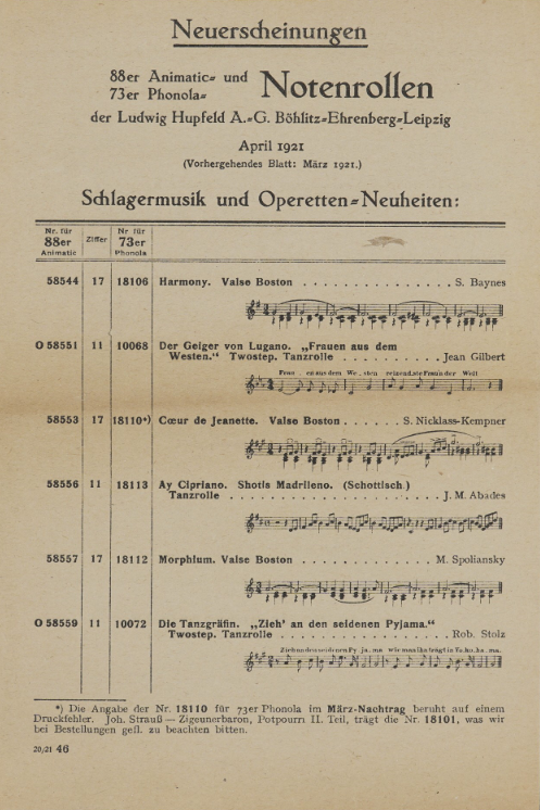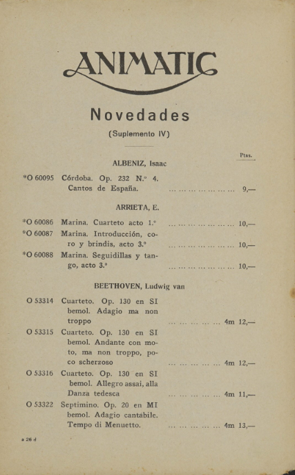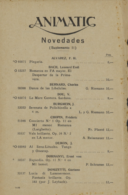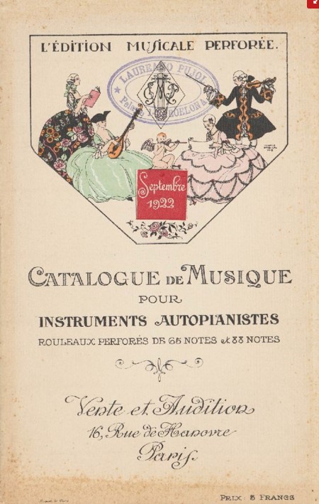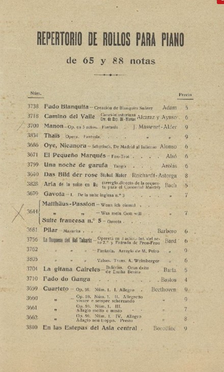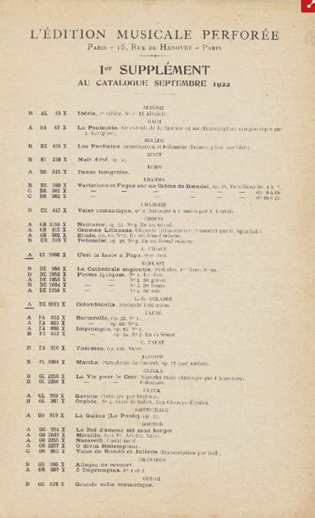 Título propio: Suplemento al catálogo de música para pianola y pianola-piano de 65 y 88 notas